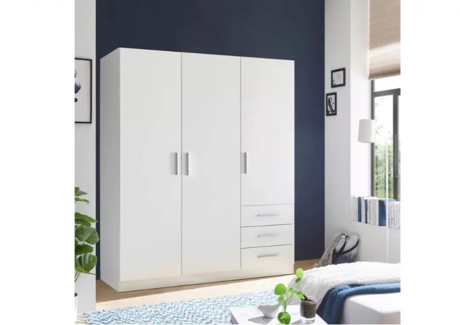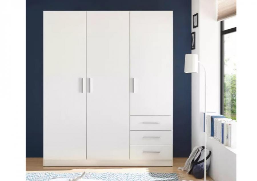 Deze kledingkast is compleet ingericht en biedt veel opbergruimte voor al uw kleding. De kast heeft drie deuren en drie lades, waardoor u alles overzichtelijk kunt opbergen.