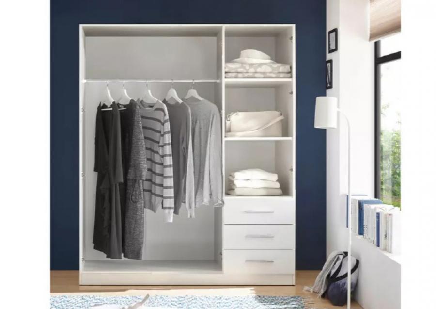 Aan de linkerzijde van de kast bevindt zich een roede, ideaal voor het ophangen van uw kleding. Aan de rechterzijde vindt u drie stevige legplanken, perfect voor het opbergen van opgevouwen kleding, en drie lades voor kleinere items zoals sokken, accessoires of ondergoed.