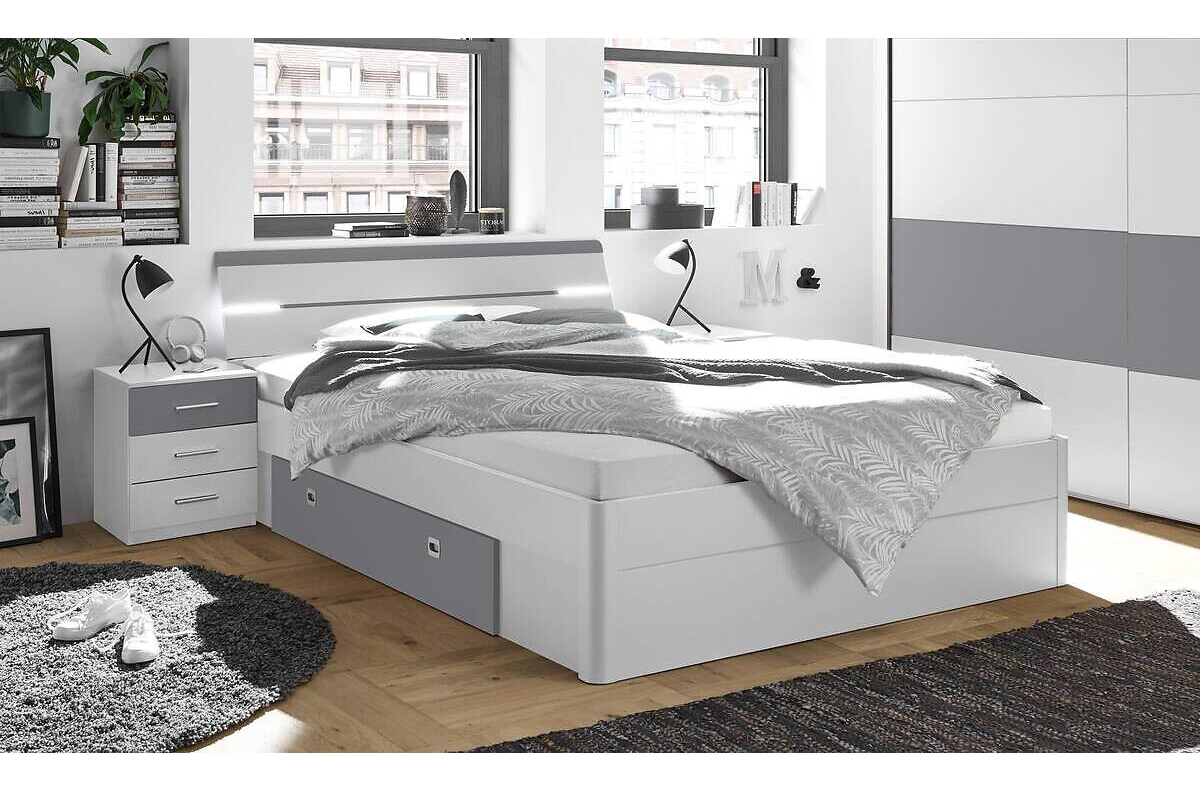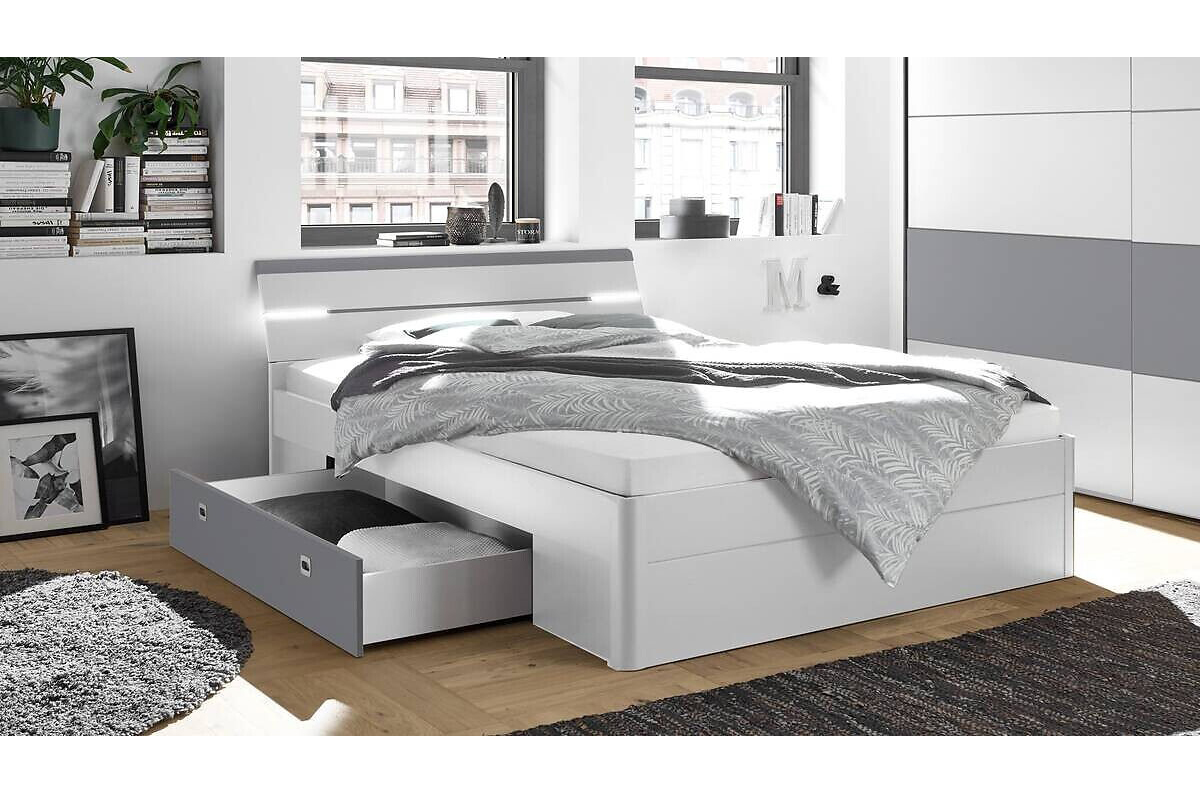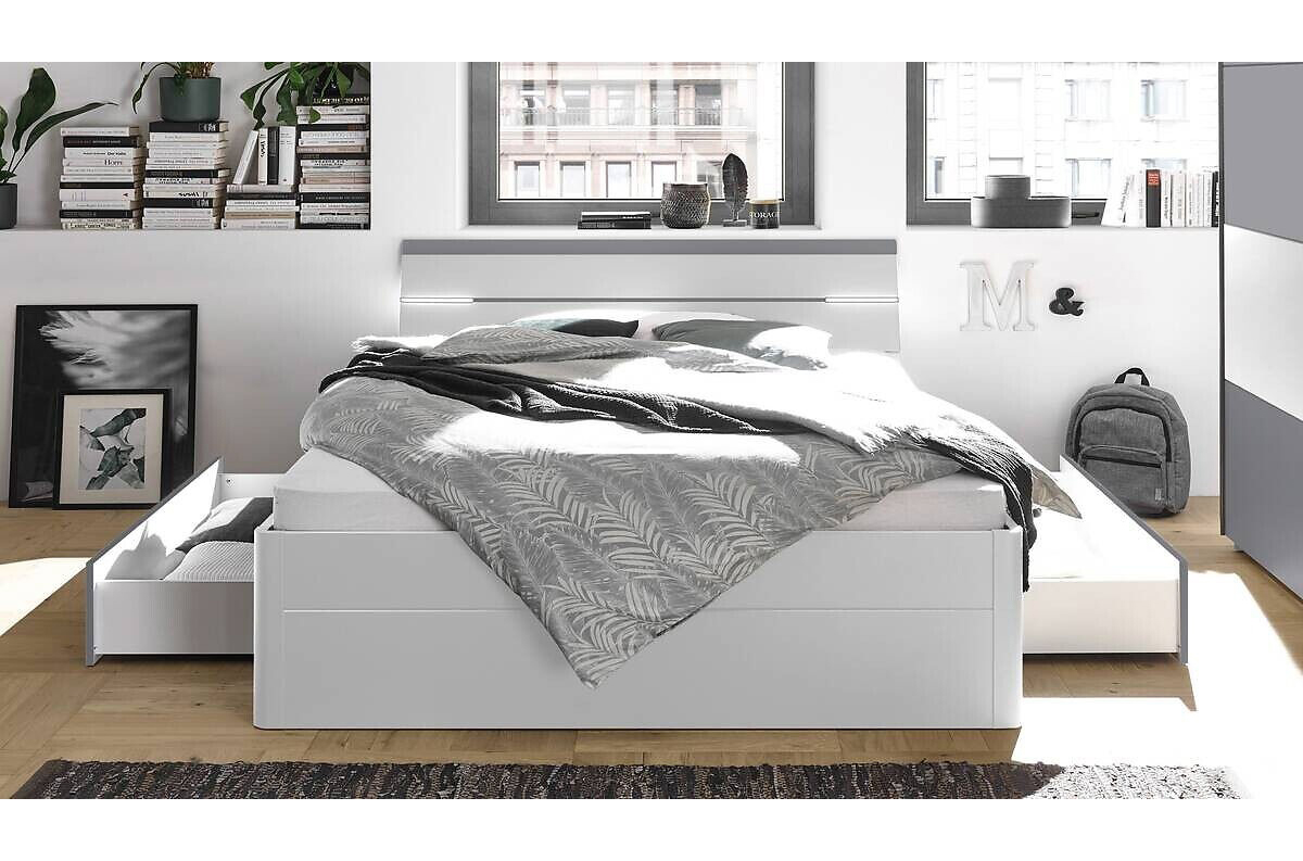 Dit tweepersoons bed 180 x 200 cm biedt optimaal comfort en functionaliteit. Het bed heeft een strak ontwerp in wit met grijze accenten. Het hoofdeind is voorzien van sfeervolle LED-verlichting voor extra ambiance. De comfortabele hoogte maakt het gemakkelijk om in en uit bed te stappen.